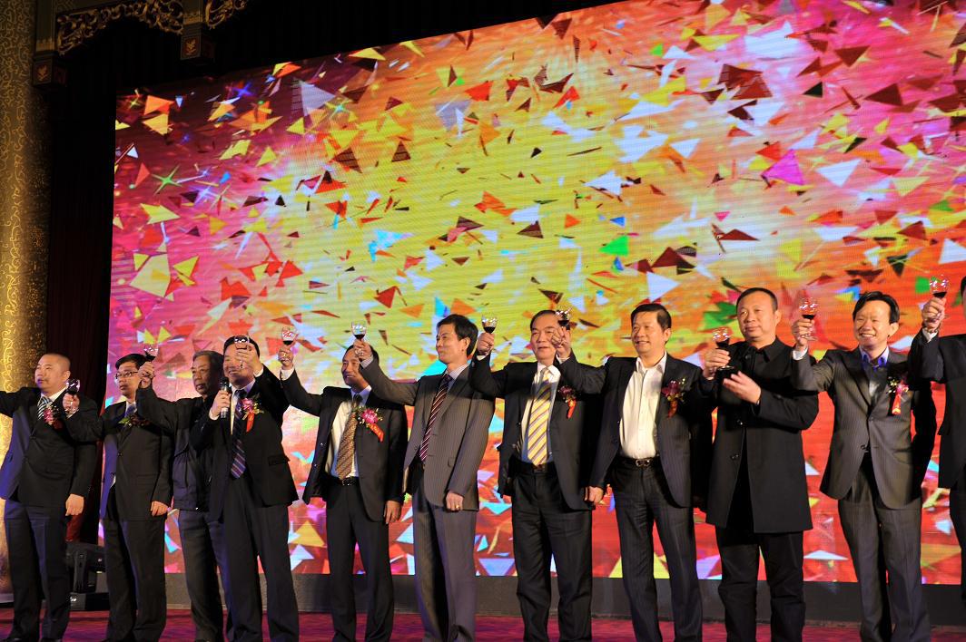 (图为商会会长、常务副会长、副会长及监事长一同登台祝酒)